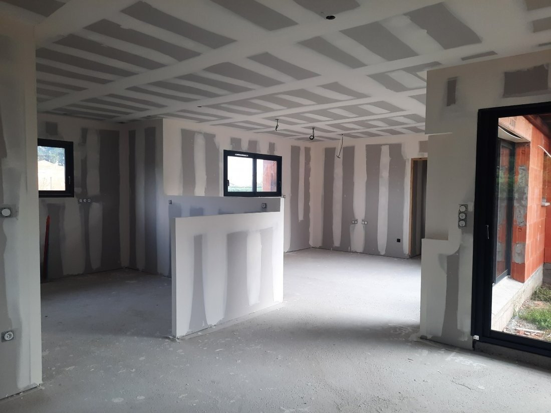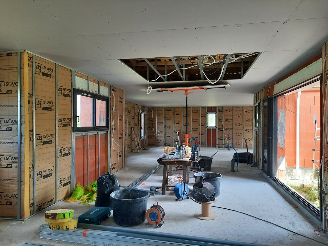 Création de cloisons sur mesure, pose de plaques de plâtre et isolation intérieure réalisée par Amelior Habitat dans une maison à Capbreton. Un chantier soigné pour un confort thermique et acoustique optimal.