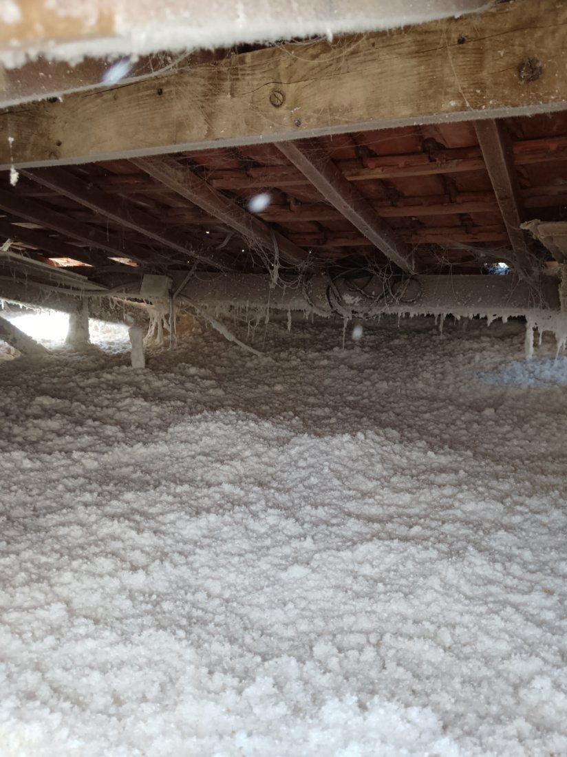 Photo montrant un artisan d’Amelior Habitat réalisant l’isolation de combles perdus à Tosse par soufflage, avec une machine projetant l’isolant pour améliorer la performance énergétique de la maison.