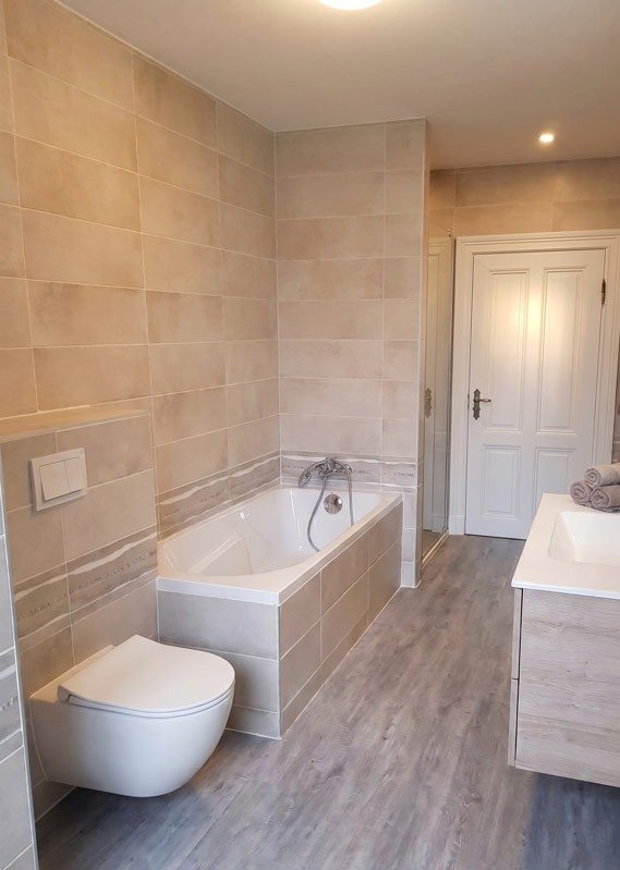 Pour répondre aux attentes, nous avons procédé à une dépose minutieuse de l’ancienne salle de bain, puis à la remise à neuf de l’étanchéité, des réseaux d’eau et d’électricité. Nous avons installé une baignoire design avec pare-baignoire, un meuble vasque moderne, ainsi que des rangements intégrés. Un carrelage clair et antidérapant a été posé pour allier sécurité et luminosité. Le résultat final met en valeur un espace élégant, pratique et convivial, où il fait bon se détendre après une journée bien remplie.